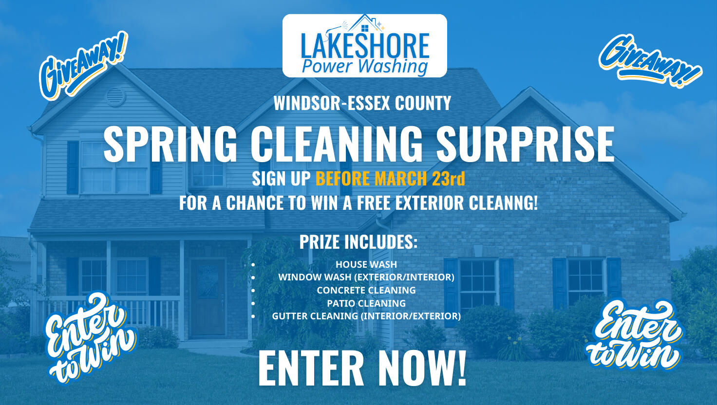 One (1) winner will be selected for the prize package, which includes house wash, window cleaning (exterior & interior), gutter cleaning (exterior & interior), and concrete/patio cleaning.