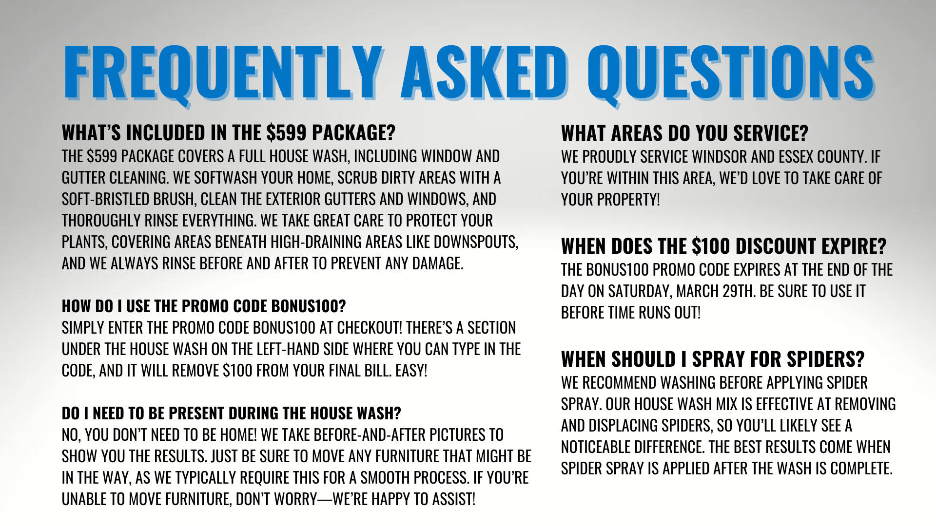 Get Your Home, Windows, and Gutters Cleaned for Just $599—the Regular Price of a House Wash! And Don’t Forget, Use Promo Code Bonus100 at Checkout to Save an additional $100!